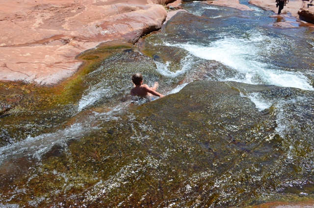 But when Indy caught sight of the teenagers and adults going down ‘slide rock’ - the natural water chute the park is named for - and with Nath egging him on of course, he stripped down to his undies and strode straight out.